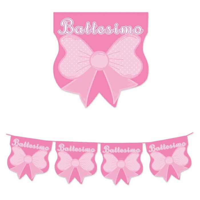 Bandierine in pvc sagomate a forma di fiocco con la scritta Battesimo. Già unite fra di loro da una stringa di plastica di colore bianco, le bandierine sono pronte per essere appese. La lunghezza totale è di 6 metri. Ogni bandierina misura 20 x 30 cm, ha lo sfondo di colore rosa con in alto al centro stampata la scritta Battesimo in corsivo e in bianco contornato di rosa più in basso al centro c’è invece la stampa di un fiocco rosa a pois bianchi. Può essere appesa all’ interno, ma anche all’esterno di una location, infatti le bandierine sono plastificate. Con un po’ di inventiva questo articolo potrebbe essere utilizzato sia come festone che come decorazione per la tavola, magari per decorare il contorno del tavolo principale dove troviamo per esempio la confettata, la caramellata o le bomboniere. E’ un addobbo per feste di Battesimo, semplice ma d'effetto garantito. La ghirlanda di bandierine rosa sarà perfetta per completare i tuoi addobbi in occasione del primo importante evento della vita della tua bambina. Per rendere tutto uniforme, in negozio e on line abbiamo in vendita altri articoli della stessa linea, ovvero coordinato tavola (piattini, tovaglioli e bicchieri), festone in cartoncino, palloncino in mylar a forma di fiocco (108 x 72 cm), palloncino in mylar tondo con la stampa del fiocco e la scritta battesimo (45 cm di diametro) Rendi unica questa festa, lasciando ricordi indelebili nel cuore di tutti!