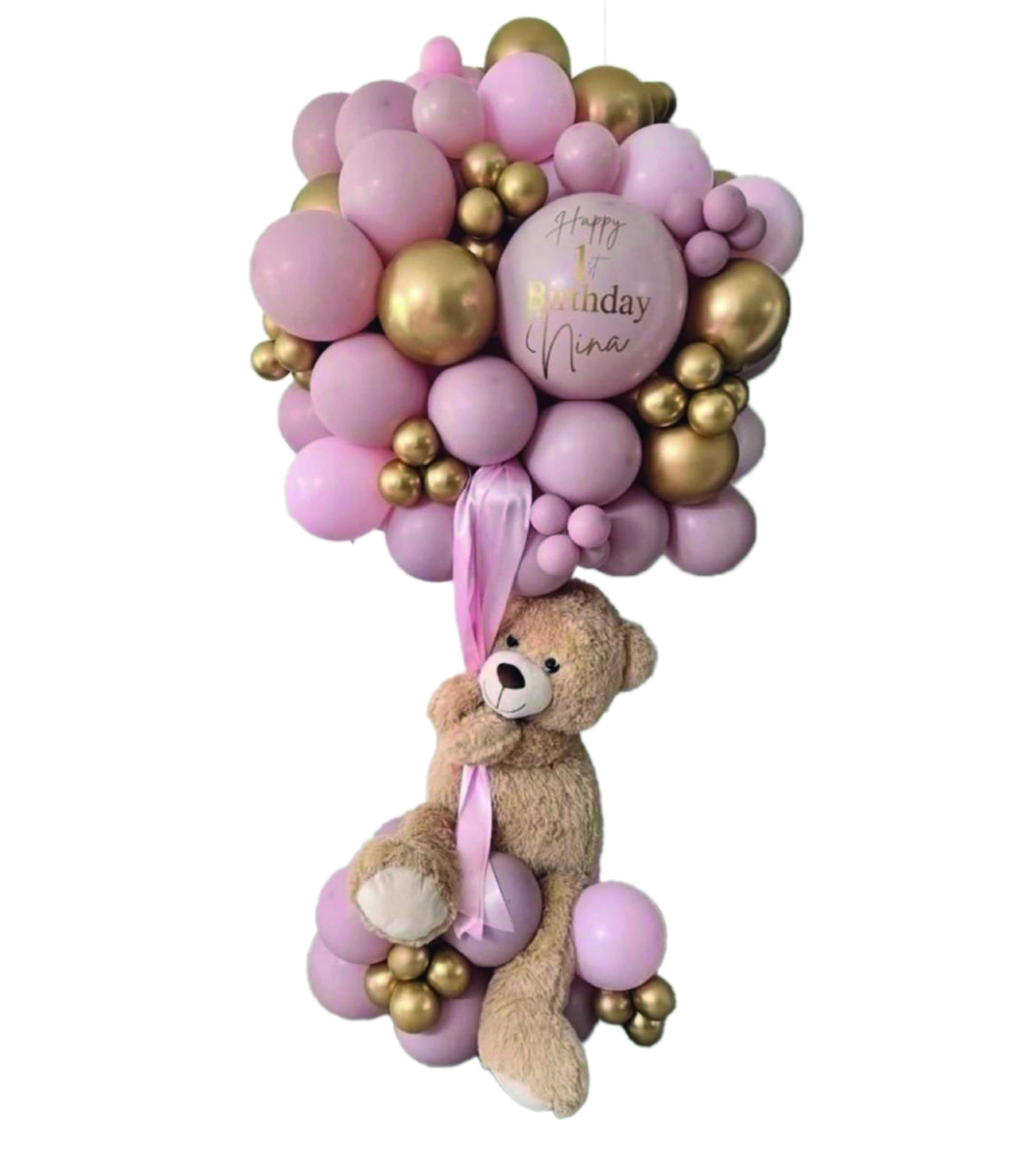 Mongolfiera gigante realizzata incrociando delle catene di link o loon,delle douplette e dei palloni tondi pastello. Ideale per essere posizionata su una piantana e alla base un orsacchiotto, per un effetto di una mongolfiera volante durante un battesimo,una festa di nascita, un gender party, un baby shower o un compleanno a tema aerei o una festa aziendale. Noleggio dell'orso escluso (20€, cauzione 50€)