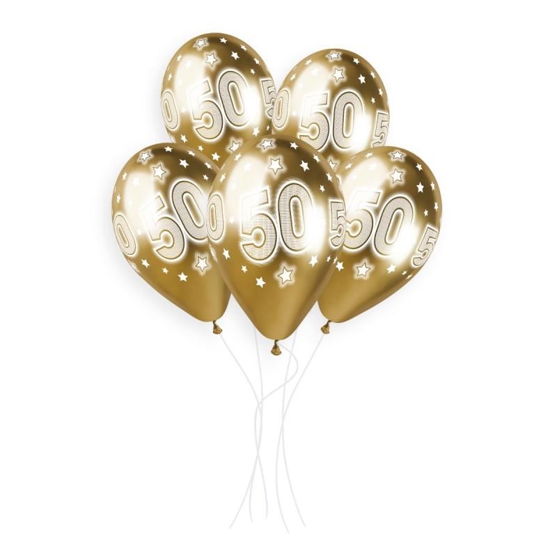 Confezione da 5 palloncini in lattice da 33cm con su scritto “50”, sono oro e super metallizzati. Perfetti per un 50esimo anniversario di matrimonio, festa il cui colore principale è l’oro, ma adatti anche per un 50esimo compleanno! Donano un fantastico effetto metallizzato oltre ad un tocco di eleganza in più! Ideali sia gonfiati ad aria (con una durata di circa una settimana) sia gonfiati ad elio (con una durata che varia dalle 8h alle 48h a seconda dell’effetto desiderato e della data dell’evento).